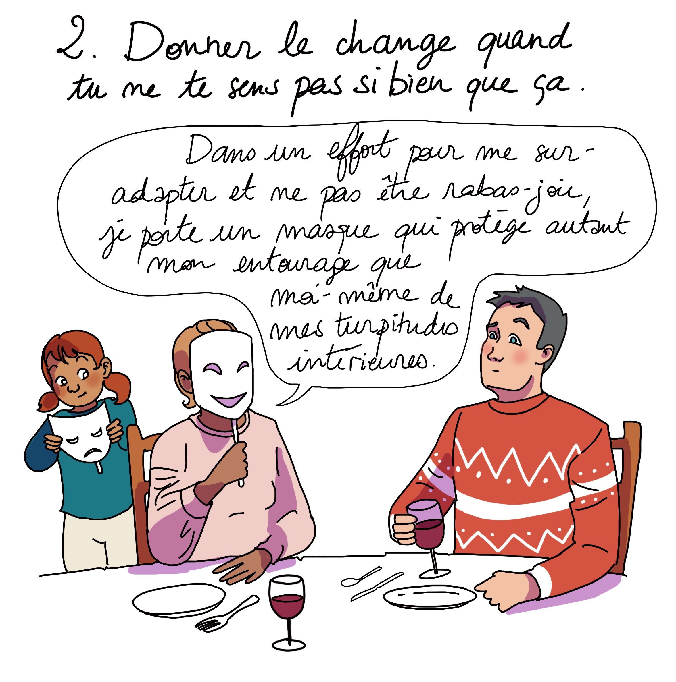 Quand on ne va pas très bien, on peut être tentée de le cacher, et de se sur-adapter à son environnement en montrant une façade agréable. Histoire de pas gâcher le mood autour de soi et de ne pas avoir l’impression d’être un boulet. Ça peut être très culpabilisant de se sentir mal, d’avoir l’impression d’être anormale au milieu d’un groupe de gens proches.
