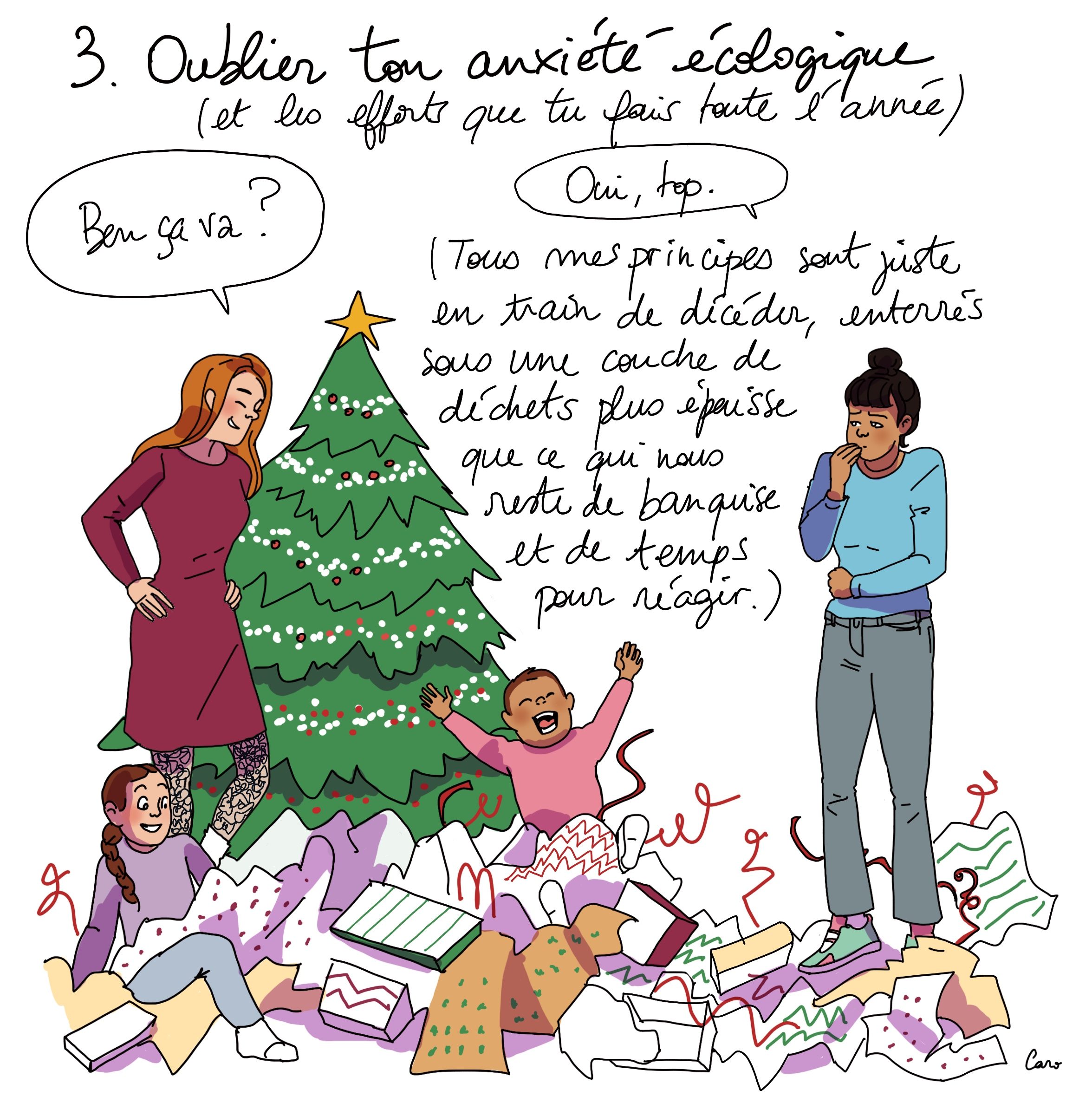 À Noël, le bonheur est de mise, mais parfois, voilà, c’est aussi un moment qui ravive des douleurs (si on a perdu un proche qui n’a plus de cadeaux au pied du sapin, si on a des souvenirs de famille douloureux, ou qu’on est obligé de supporter quelqu’un de toxique). Ça peut être aussi un moment de sur-stimulation pour les personnes sensibles ou juste fatiguées, qui prennent sur elle pour rester des heures en groupe alors qu’elles voudraient juste s’isoler.